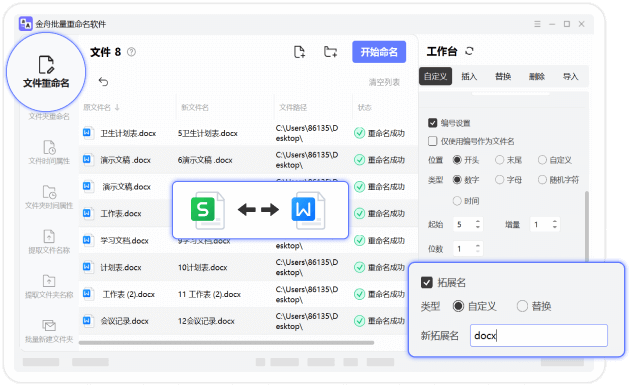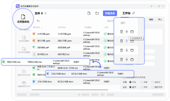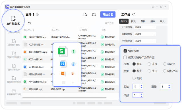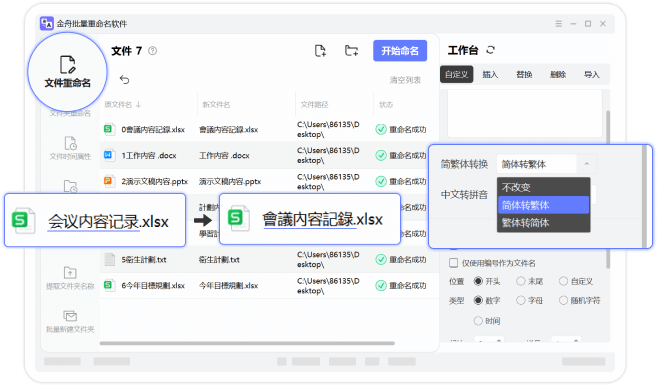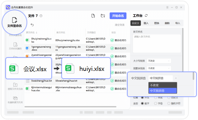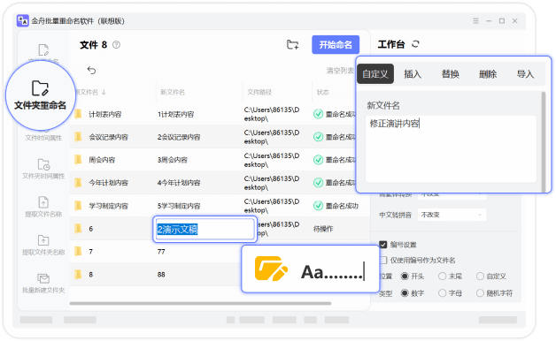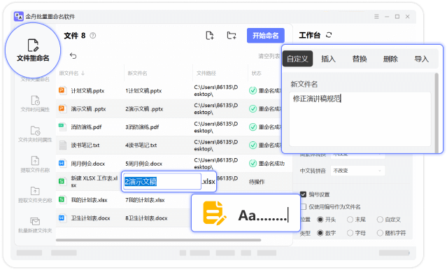 支持一键自定义重命名文件名和文件夹名称,不论图片、PDF、歌曲、文档等等;批量替换文件名任意内容,一次性删除文件名中特定文字,以及指定位置的内容,并支持 Excel 表格导入文件名批量重命名。