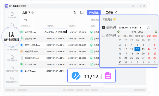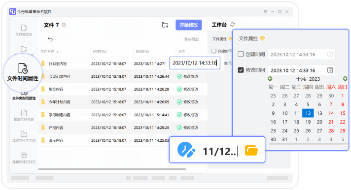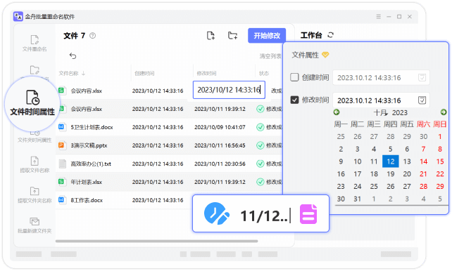 轻松修改文件&文件夹的创建时间和修改时间,采用直观的日历选择器,精确到分秒,操作方便快捷,一键批量处理,让您省去繁琐的手动操作。