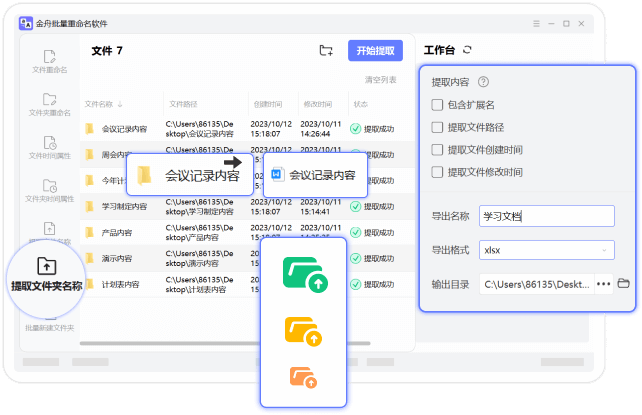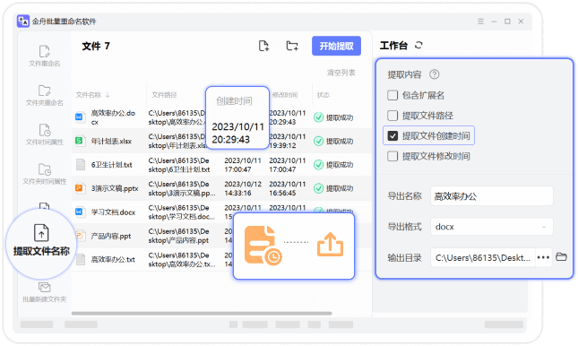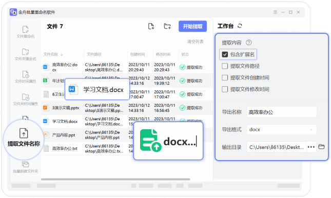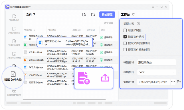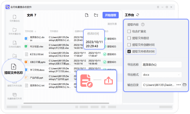 一键批量提取文件或者文件夹名称,支持将文件名导出成 xlsx、docx、TXT 格式,还可以提取拓展名、文件路径、文件创建时间、文件修改时间,大大提升工作效率。